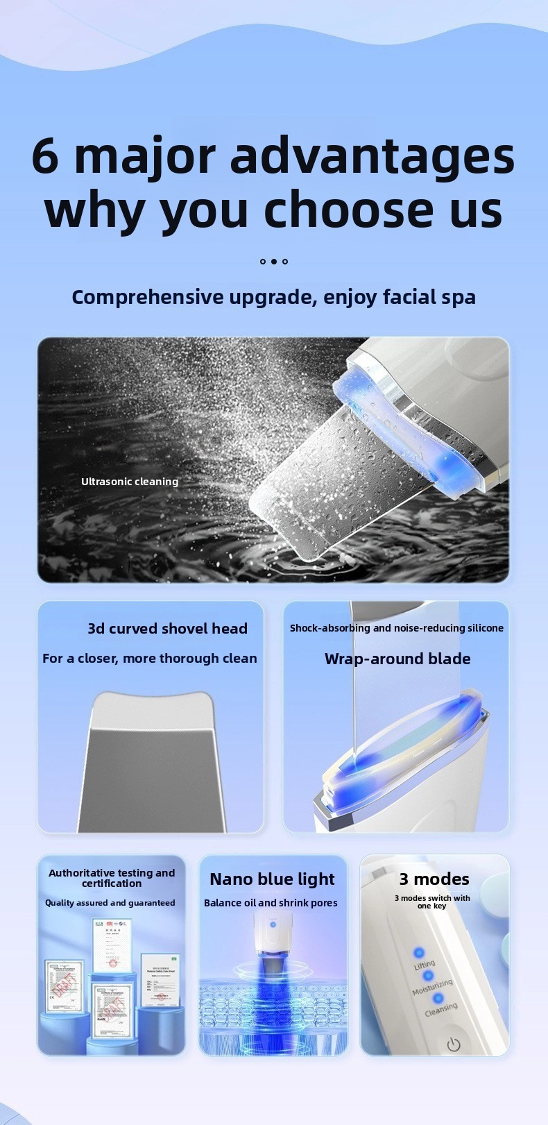 Ultrasonic Technology: Utilizes high-frequency ultrasound for deep skin cleansing and exfoliation.
